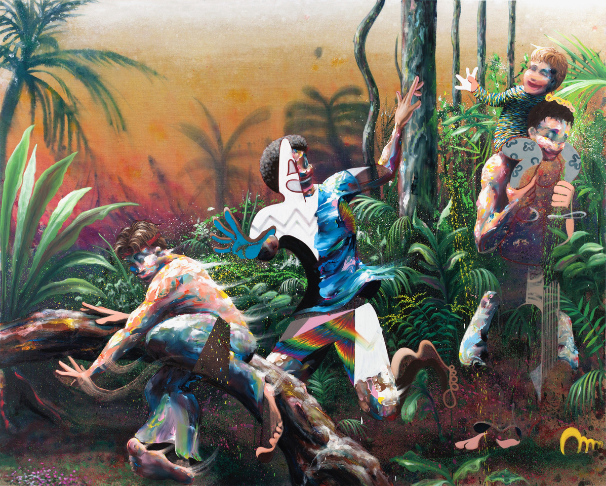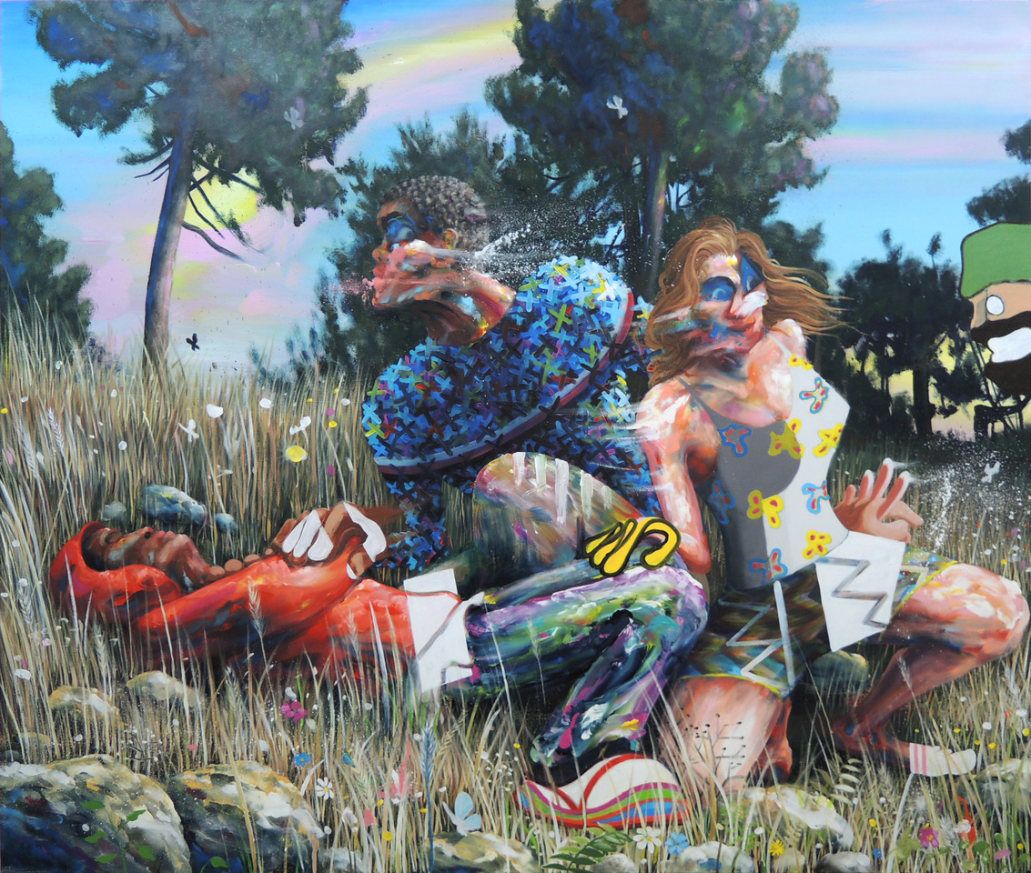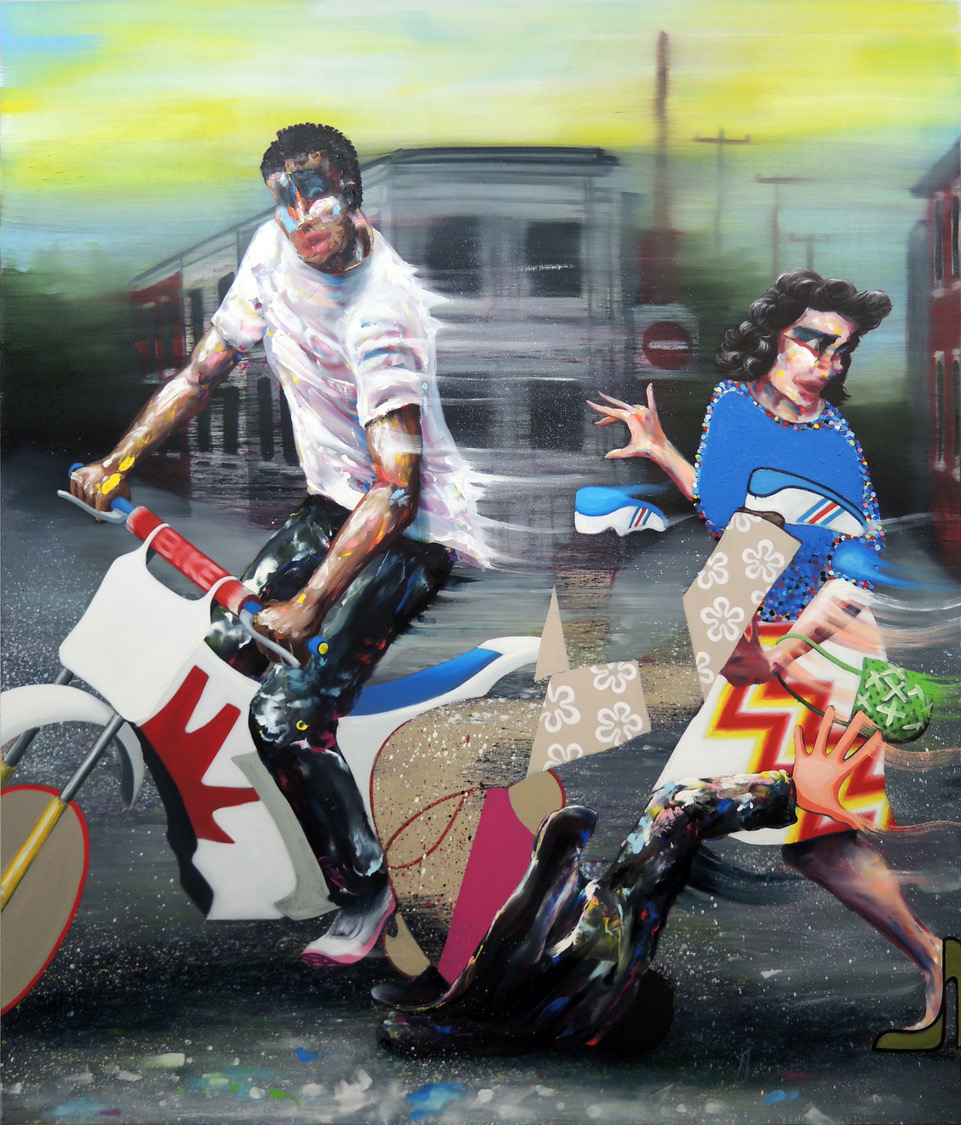 This formal heterogeneity unfolds through shifting techniques within a single canvas: simplified flat areas, blurred passages, or sprayed textures coexist, generating ruptures in space and time. His sculptural, fragmented figures emerge from unstable worlds where the trivial meets the mythological.