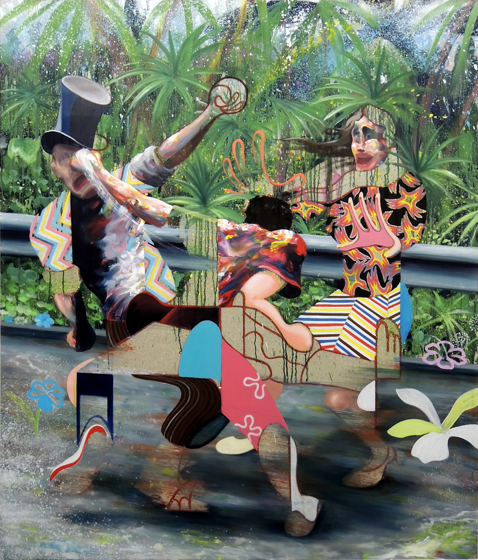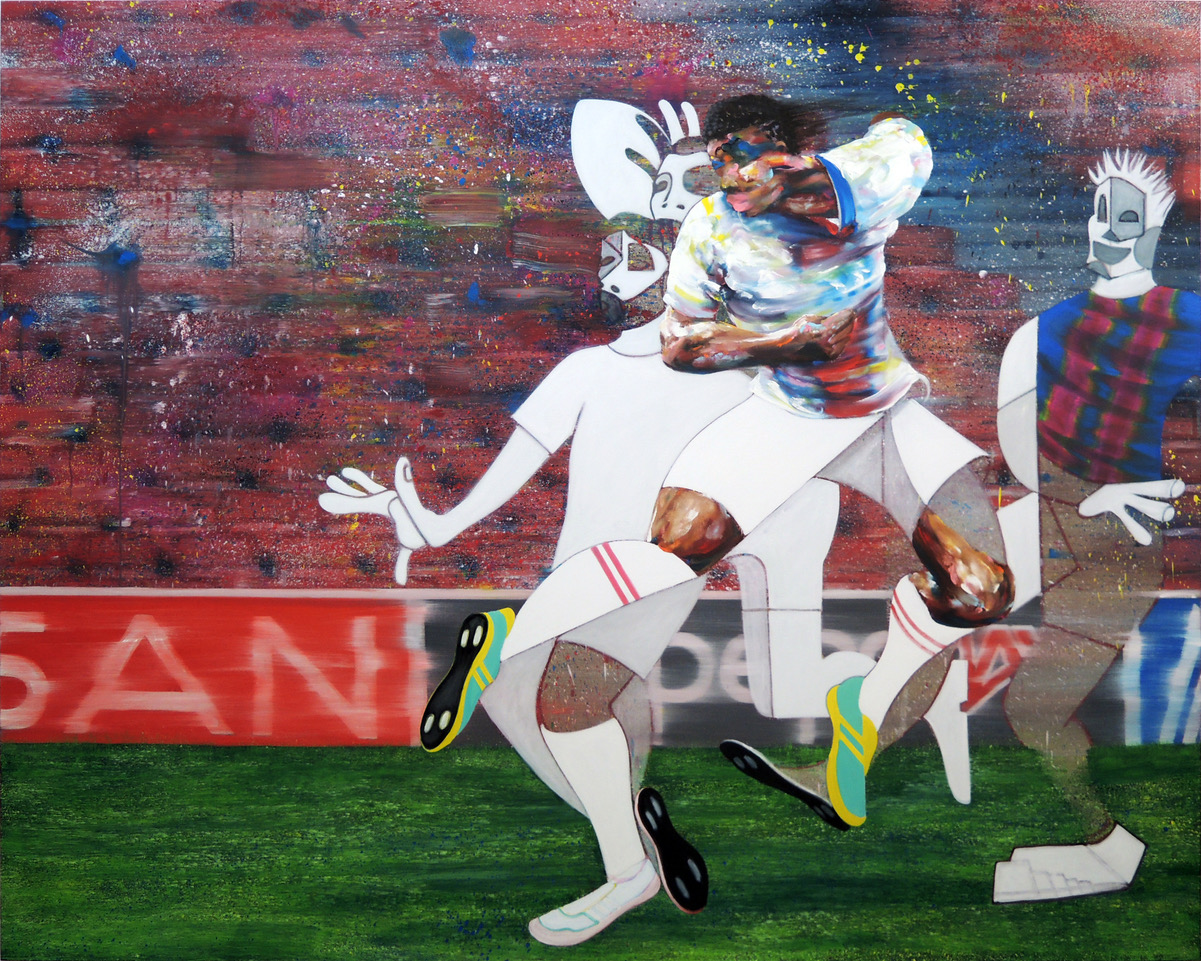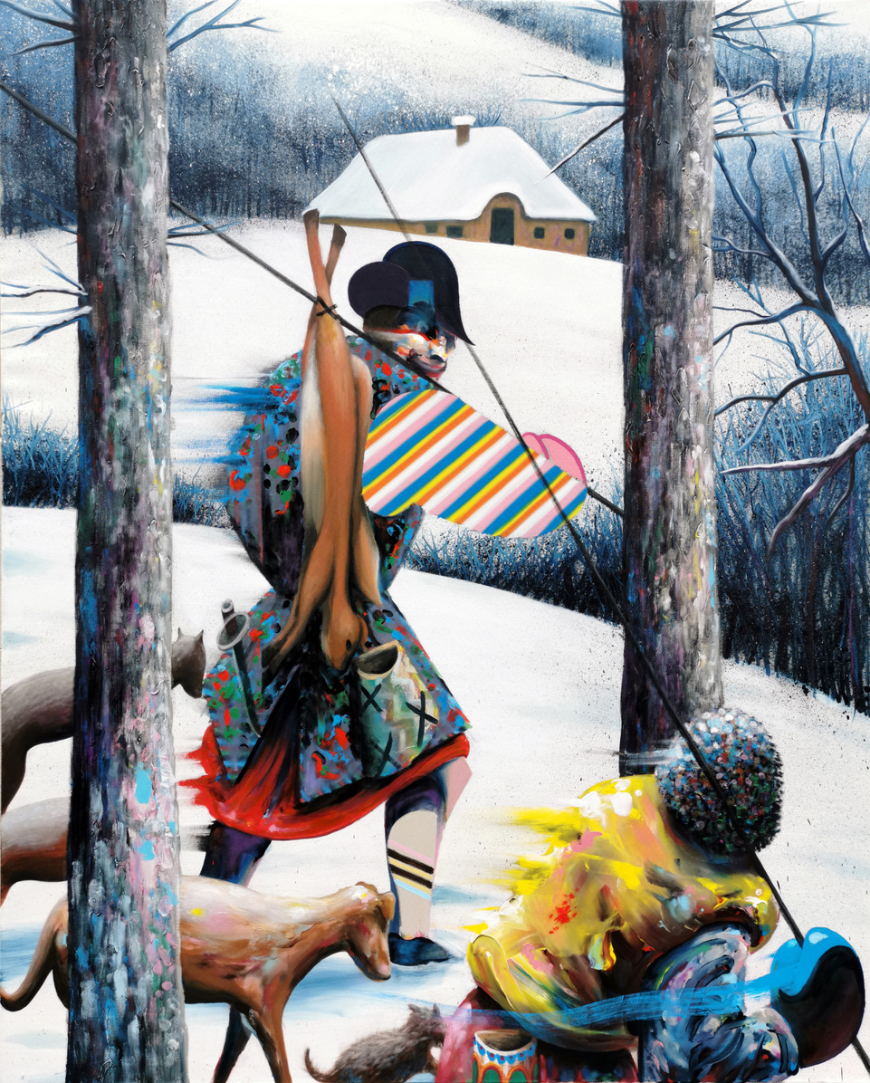 This formal heterogeneity unfolds through shifting techniques within a single canvas: simplified flat areas, blurred passages, or sprayed textures coexist, generating ruptures in space and time. His sculptural, fragmented figures emerge from unstable worlds where the trivial meets the mythological.